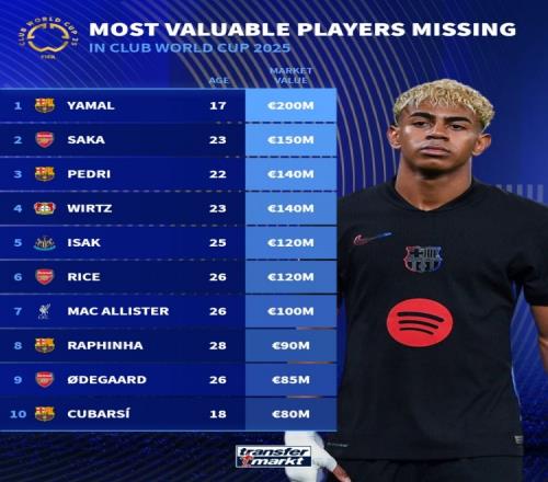 体育播报6月14日宣 德国转会市场统计了缺席世俱杯球员的身价,并列出榜单,亚马尔2亿欧居首,萨卡1.5亿欧次席。